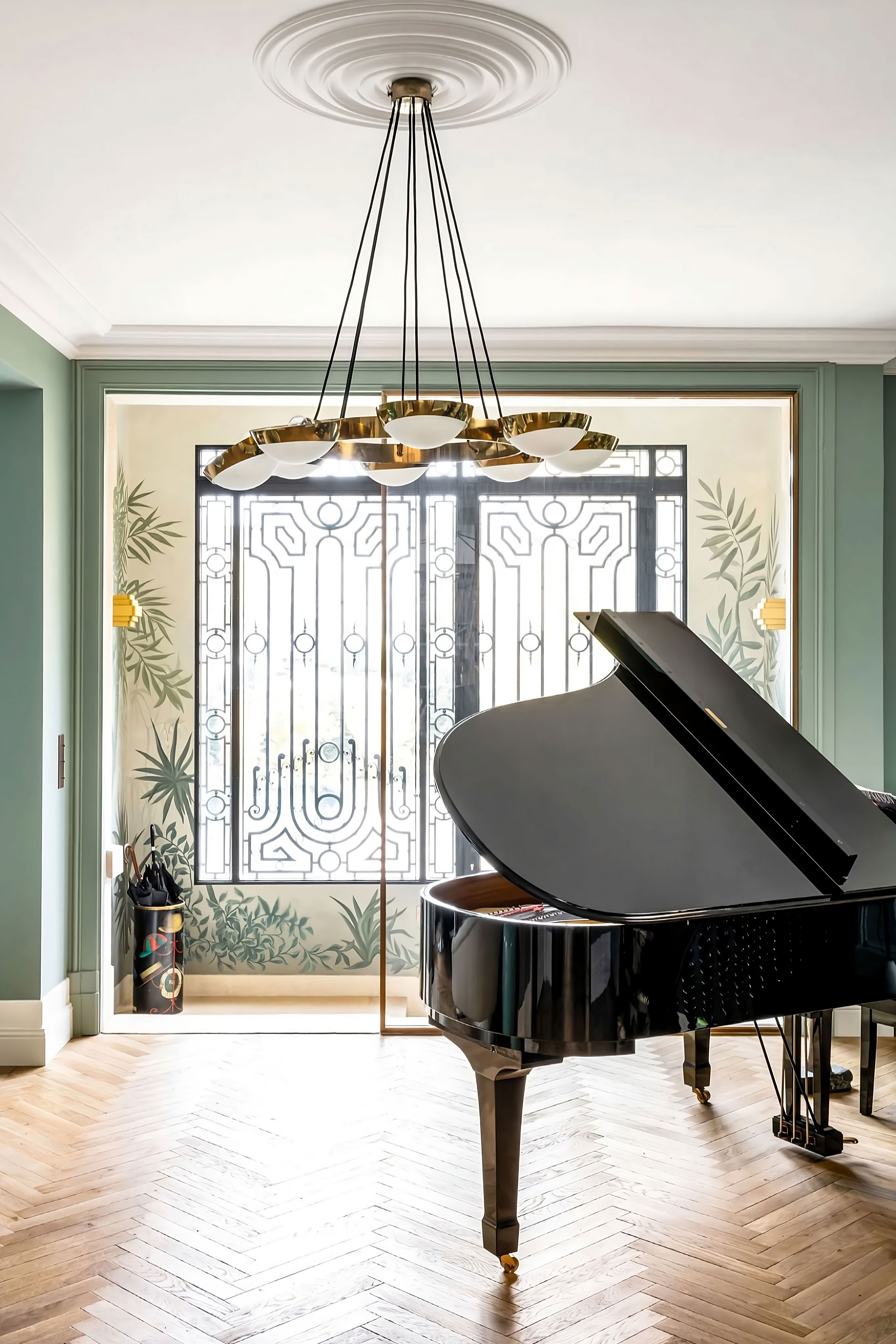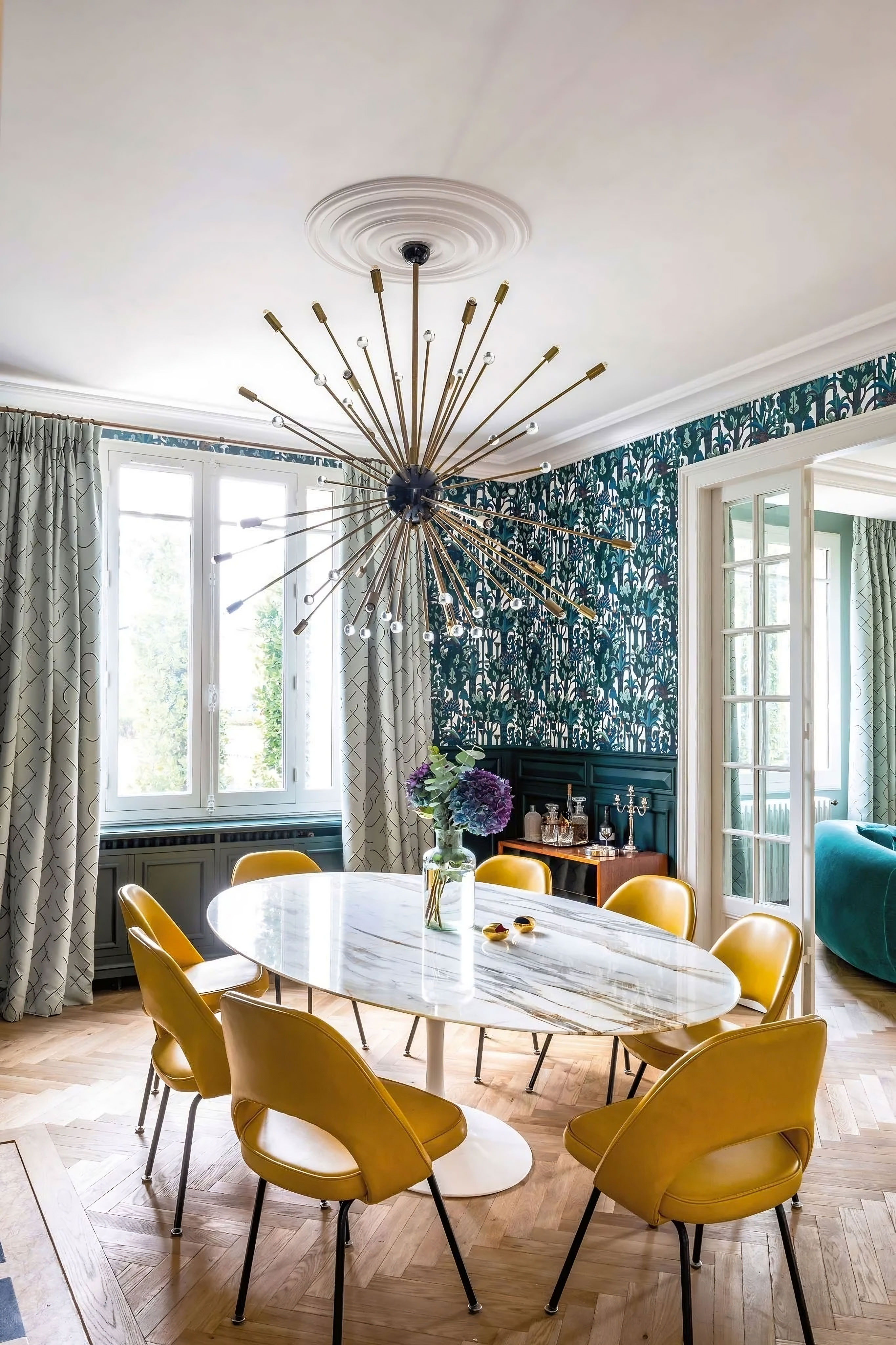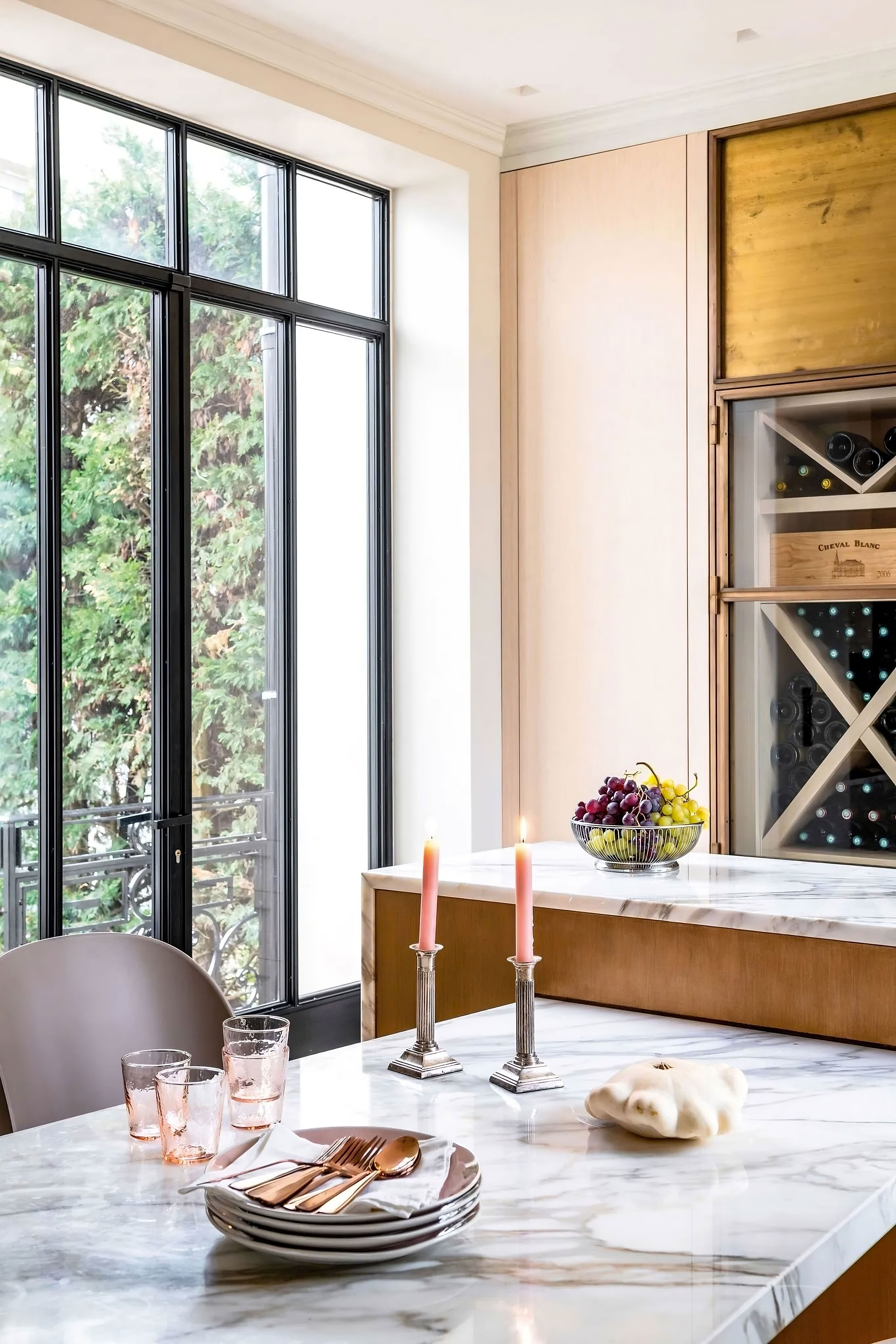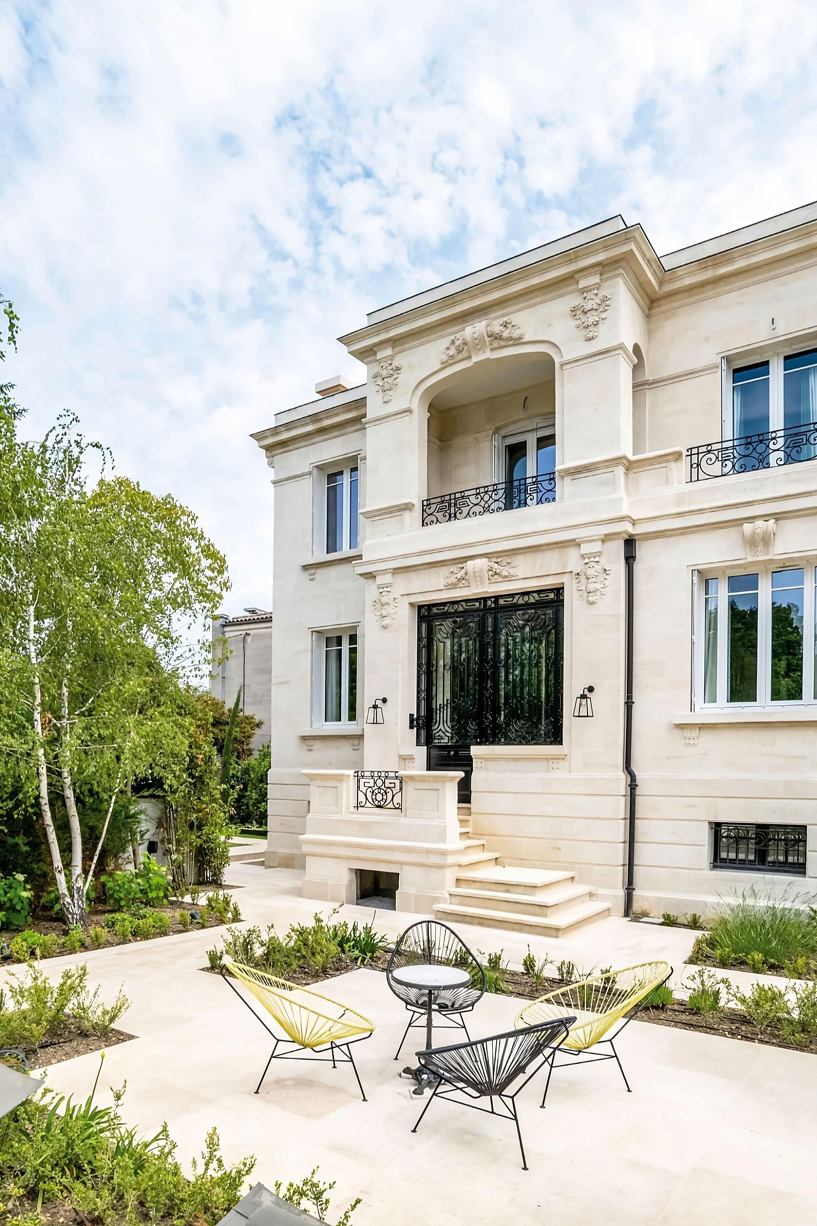 Pour ce projet d'aménagement de mobilier sur mesure d'un hôtel particulier des années 30 de Bordeaux, la décoratrice Nicole Joinau a mené une restauration minutieuse avec l'aide d'artisans d'art pour redonner vie à cette magnifique propriété. Le propriétaire, qui avait déjà collaboré avec Nicole Joinau pour la restauration de précédentes maisons, souligne le soin apporté aux détails. Les éléments d'époque les plus intéressants ont été conservés, tels que la porte d'entrée, le vitrail de l'escalier, les cheminées et les boiseries du salon. Les pièces de designers et les matières nobles ont été utilisées pour créer une ambiance intime teintée de féerie. Le mobilier sur mesure, y compris la cuisine, le salon, les dressings et les salles de douche, a été réalisé par nos soins. La ferronnerie a été conçue par Julien Castilla-Madrigal, qui a accompli un travail remarquable sur les portes de la cuisine et de la cave à vin. Le résultat est une partition bien orchestrée qui met en avant la vision artistique de Nicole Joinau.